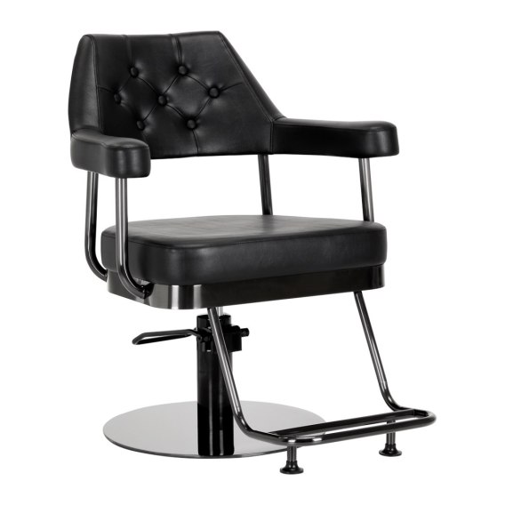 Solidna, okrągła podstawa gwarantuje stabilność w trakcie użytkowania. Gładka powierzchnia o lustrzanym wykończeniu sprawia, że element ten jest łatwy do utrzymania w czystości. Szerokie siedzisko, wypełnione pianką o odpowiedniej twardości, zapewnia wysoki komfort użytkowania i wygodę nawet podczas wielogodzinnych zabiegów. Znacznym plusem jest dedykowany do tego modelu podnóżek, który zapewnia stabilne oparcie dla stóp użytkownika. Podłokietniki znajdują się na odpowiedniej wysokości, dzięki czemu pozwalają na prawidłowe ułożenie barków klienta - sprawia to, że nie chowa głowy w ramionach ani się nie garbi - wyraźnie usprawniając zabiegi, w tym strzyżenie. Ułatwia to precyzyjne wykonywanie usług.
