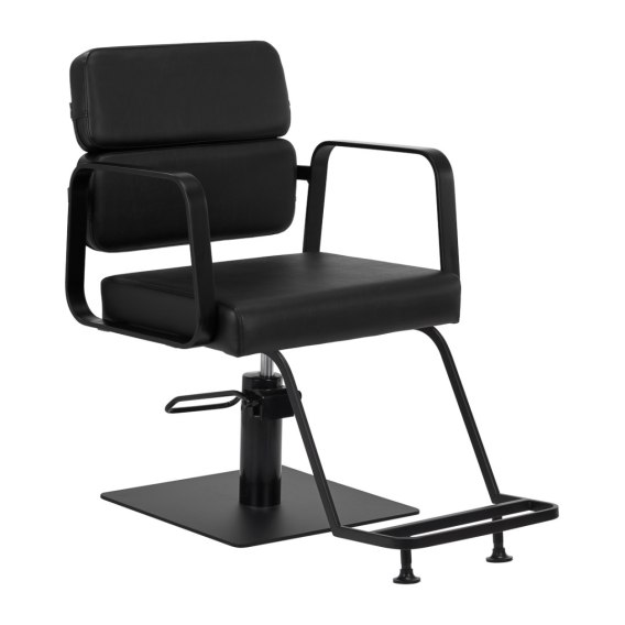 Mechanizm pełnego obrotu, w który jest wyposażony fotel, sprawia, że praca fryzjera staje się bardziej efektywna i wygodna. Solidna, płaska podstawa w kształcie kwadratu gwarantuje stabilność w trakcie użytkowania. Matowo wykończona, gładka powierzchnia nadaje elementowi elegancki wygląd i sprawia, że ten jest łatwy do utrzymania w czystości. Wygodne siedzisko z wypełnieniem z pianki zapewnia wysoki komfort użytkowania, nawet podczas wielogodzinnych zabiegów. Geometryczne, metalowe podłokietniki pozwalają na prawidłowe ułożenie barków klienta - sprawia to, że nie chowa głowy w ramionach ani się nie garbi - co wyraźnie ułatwia wykonywanie precyzyjnych zabiegów, w tym strzyżenia. Dedykowany do tego modelu stylowy podnóżek zapewnia stabilne oparcie dla stóp użytkownika.