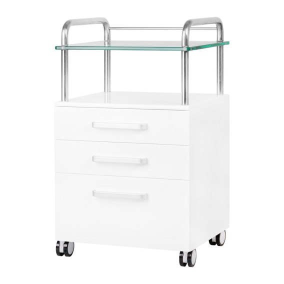 Wysokiej jakości pomocnik podologiczny to funkcjonalny mebel kosmetyczny na kółkach. Dzięki swojej mobilności możesz transportować go do innych pomieszczeń zabiegowych. Pomocnik posiada szklany blat roboczy, trzy szuflady na narzędzia, akcesoria oraz półkę na frezarkę podologiczną lub inne urządzenie.