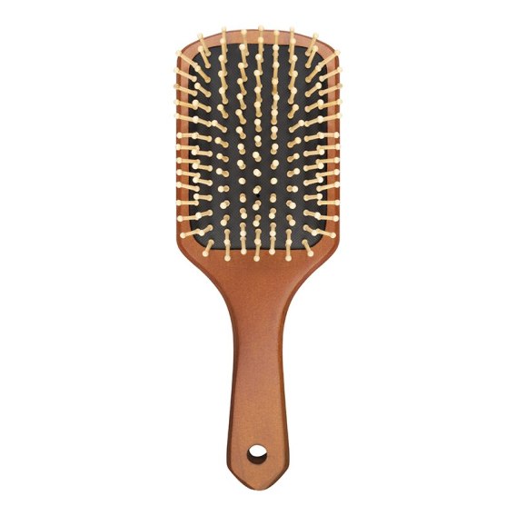 Drewniana szczotka do włosów wypozażona w drewniane szpilki, które mają zaokrąglone końcówki i umieszczone są na gumowej poduszce. Gumowa poduszka z otworem pozwala na prawidłową prace szczotki podczas czesania. posiada włściwości antystatyczne, włosy podczas czesania się nie elektryzują.